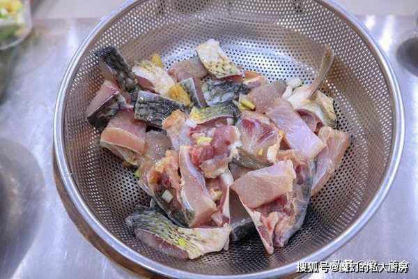 这个时候鱼块也腌好了,我们把它倒在笊篱中,控干上面的料汁。