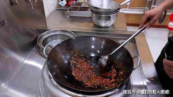 5.食材全部准备好以后,我们把酱料炒一下,锅内烧油,油烧热以后,把剁椒末、葱姜末等小料放入锅中进行煸炒,炒干里面的水分,大约炒2分钟,炒出香味以后,加入两勺白糖中和辣味,一勺鸡粉,生抽5克,陈醋5克,陈醋能够软化鱼骨,使鱼肉更加鲜嫩,翻炒均匀以后起锅,这一步的目的是为了让红剁椒更入味。