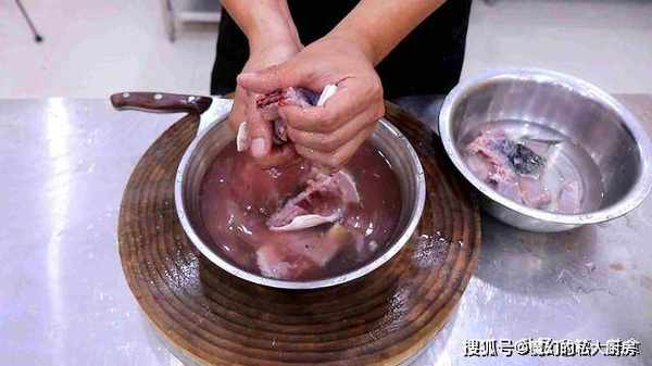2.然后把鱼骨和鱼肉分别剁成均匀小块,用清水多抓洗两遍,充分洗净上面的血水和粘液,然后把鱼块倒出来,挤干水分备用,这一步是进一步去除鱼的腥味。