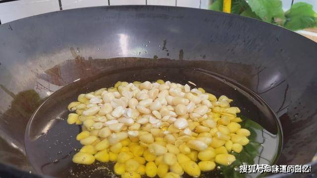 6、冷冻好的花生米不用解冻,直接下入锅中,注意这里是冷油下锅,千万不要把油烧热再下锅,下锅后,用漏勺不停的搅动,用小火慢炸可以看到有好多的小气泡冒出,这其实就是花生米中的水在蒸发,把水分榨干以后花生米吃起来,才会比较的脆爽。