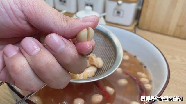 4、这个时候花生米也泡好了,用手轻轻的一搓皮掉了,处理成这个样子就可以了,这个过程比较的繁琐,可以找家人帮忙一起处理。