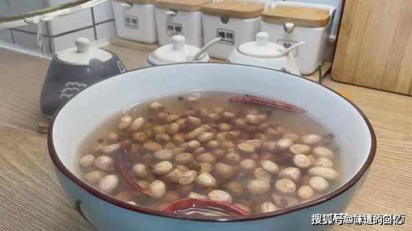 2、准备一个小碗,小碗加入花椒,来点麻椒,再来三颗干辣椒。烧上一锅水,水开下入之前准备好的香料,盖上盖子,煮上五分钟,把煮好的汤汁倒入到花生米中,水量刚好能没过花生米即可,盖上盖子焖上二十分钟。