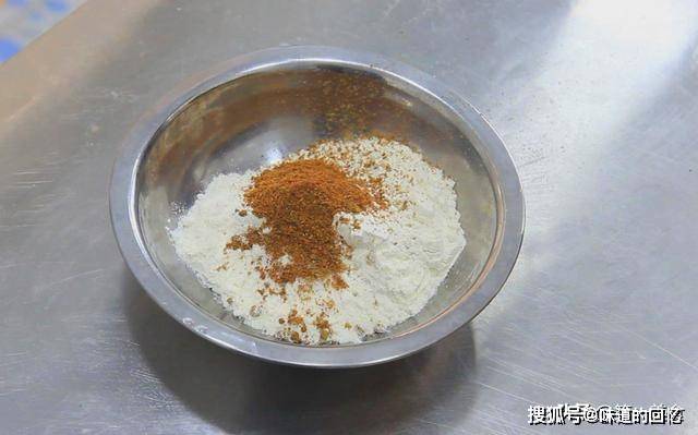 这个时间我们先来做一点油酥:拿一个小盆放入面粉30克,食盐2克,五香粉3克。