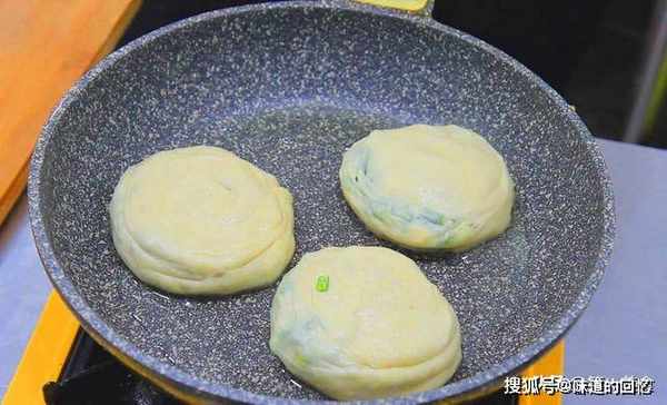 锅内倒油,把锅烧热,倒出热油,把适量葱花饼放入锅内,加少油,同时晃动平底锅使面饼煎色更均匀 。