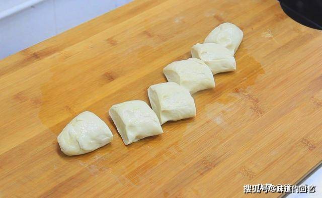 做好这些准备工作,面团已经醒好了,在案板上面抹上少许植物油,这样防止面团粘在案板和手上面,将面团揉成长条,切成几个等份。