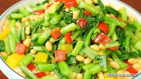 盆中加入菜心粒,加入食盐、 鸡粉、 芝麻香油提鲜,倒入一罐茄汁黄豆 ,颠盆拌匀即可装盘。