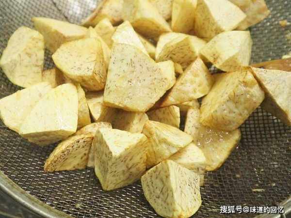 起锅烧油,油温五成热时将五花肉下入锅中煎制两面金黄,勤翻勤搅煎出猪油,捞出控油备用;然后趁着热油,把芋头也炸一下,让其表面定型防止炖碎,把芋头炸成金黄色,微微带着点焦边,即可捞出控油。