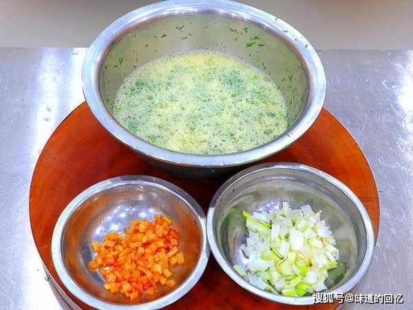 准备一把小茴香清洗干净切成碎粒;在盆中打入五个鸡蛋,加入食盐2克、少许料酒去腥,然后用筷子搅散,再加入小茴香粒搅拌均匀备用;准备半个红椒切成小粒;一段大葱破开切成葱花备用。