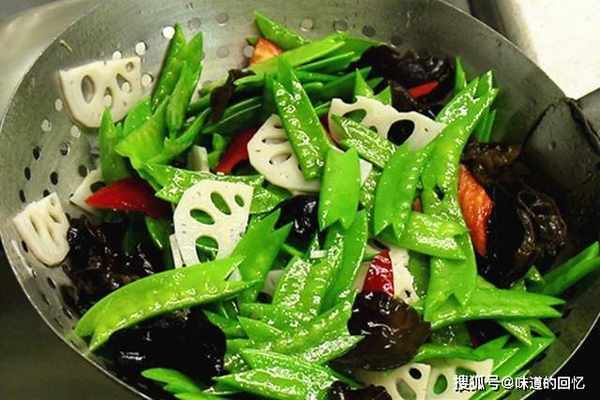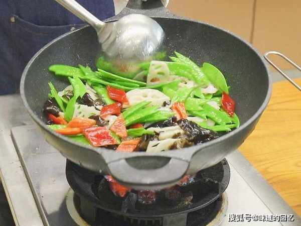 锅内加入清油,油温五成热时倒入配菜,开大火快速翻匀,沿锅边烹入碗料,保持大火快速收紧后立即出锅,青脆可口的小炒荷塘即可享用。