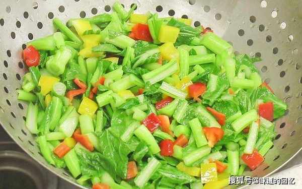 起锅烧水,加入少许植物油和食盐,大火烧开以后先倒入彩椒粒 ,再倒入菜心,快速汆煮10秒钟后倒出来,立即过一下凉开水,然后控水备用。