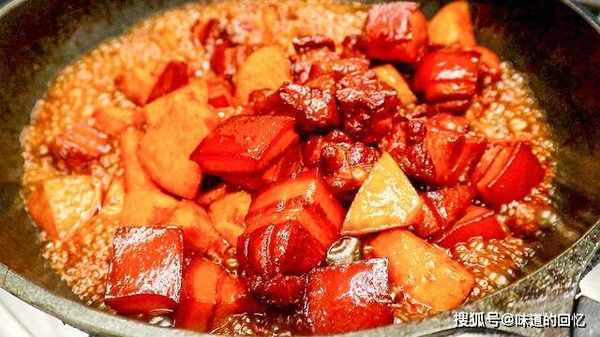 锅里留底油,撒进去一把冰糖炒碎,熬成呈棕红色的糖色,起泡时倒入五花肉快速颠锅,把颜色炒均匀,然后沿锅边倒进去一罐啤酒去腥增香,再加适量生抽、食盐、冰糖搅匀。
