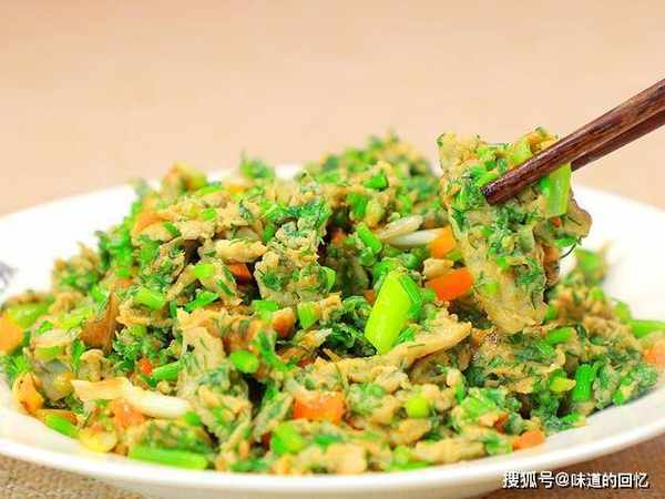 再放入葱花翻炒出葱香味,一面凝固以后翻过来煎另一面,这样葱香才能充分和鸡蛋融合,像煎蛋饼那样来回多翻几次,把鸡蛋液全部定型用勺子炒散,再倒入红椒粒快速翻炒一会儿,再加入一点芝麻香油美味即成。