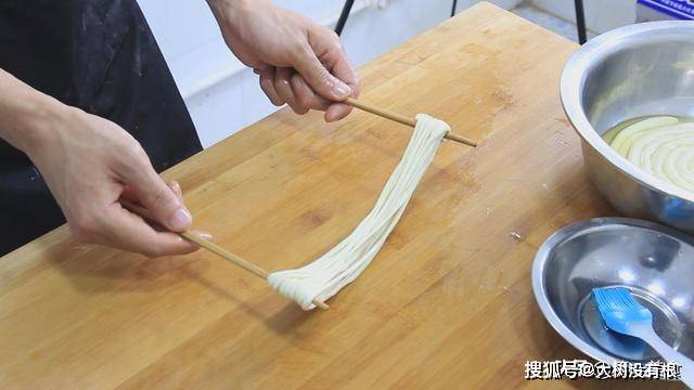 面条饧好以后我们开始炸制,锅内烧油,等待油热的时间,我们将面条取出来,一头夹在左手的虎口处,用右手把面条往外拉成细条,这个过程不要用力过猛,免得把面条拉扯断。拉好以后,把面条在另一个手指上缠9~10圈,再取一双筷子,撑在缠好的面条圈内,用双手拿住两头,往外轻拉至20厘米左右长。