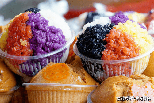 ,用四种天然色素给糯米染色后蒸制而成。现在条件好了,可以用各种彩色的食材代替。