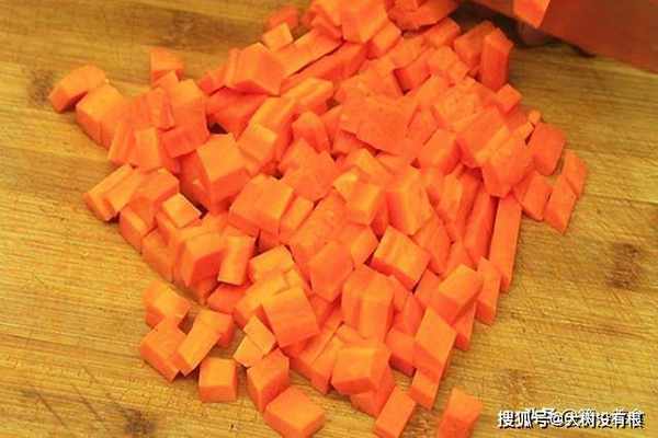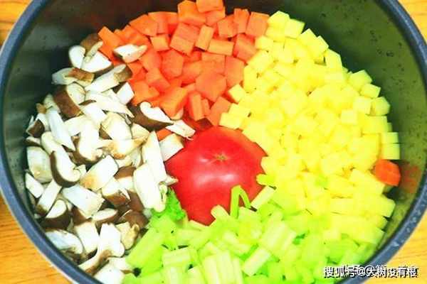 首先,我们准备几朵香菇,一根胡萝卜,一小把芹菜、一个土豆、几根腊肠,把蔬菜都切成一样大小的丁,腊肠切成片备用,其实还可以加一些豌豆粒和玉米粒。