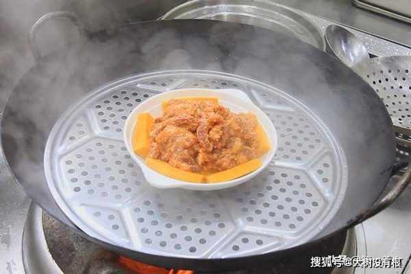 然后上面放上腌制好的肉片,锅内烧水,水烧开以后,把粉蒸肉放在篦子上,