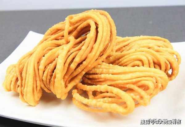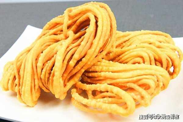 油温升至七成热时,把拉好的面条慢慢浸入油锅,然后将一头扭到一边,稍微定型后抽出筷子。