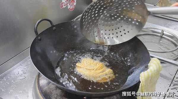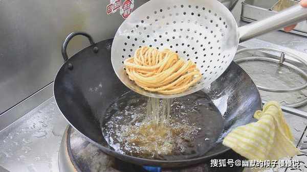 投入七成热的油锅中,慢慢浸入油锅,然后将一头扭到一边,稍微定型后,