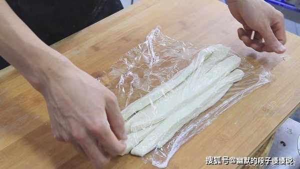 一定要把植物油刷匀了,不然容易粘在一起,然后把长条摆在一起,盖上保鲜膜再饧10分钟。