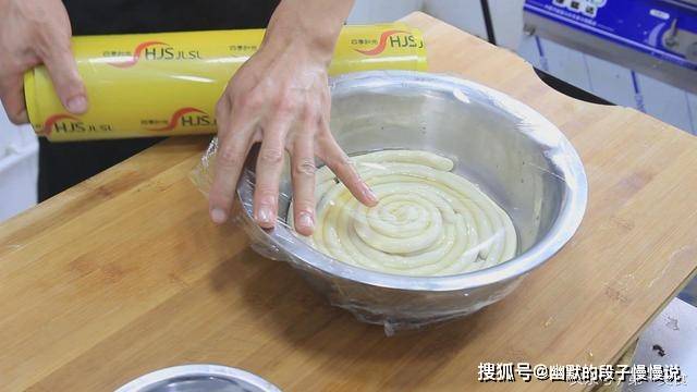 然后再在盘好的粗条上面刷上一层植物油,盆中再次盖上保鲜膜,饧发30分钟。