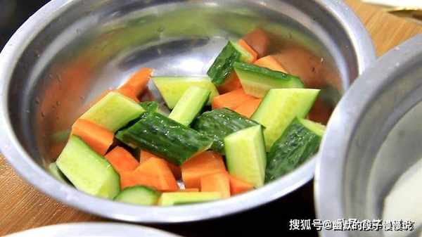 胡萝卜一块,切成胡萝卜丁,黄瓜一段,同样切成黄瓜丁与胡萝卜丁放在一起备用。