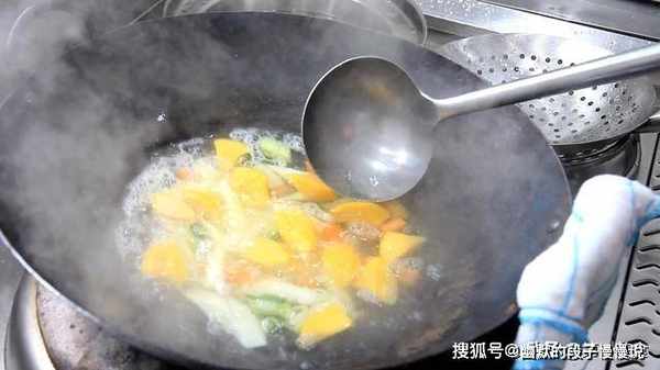 3.锅内再烧水,倒出泡山药的水,再把山药放在锅中,水烧开以后,打去锅中的浮末,放入黄桃,最后再倒入黄瓜丁和胡萝卜丁,很快就倒出全部的食材控水。