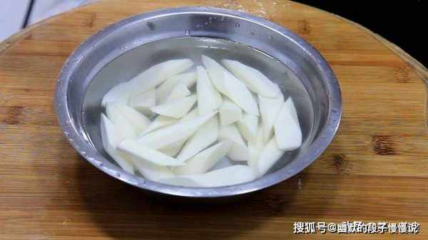 1.首先我们准备一下食材:山药削去外皮,切成滚刀块放在盆中,加入清水浸泡,加入清水防止山药在空气中氧化变黑,放入白醋一克,放入白醋可以使山药保持亮白的颜色。