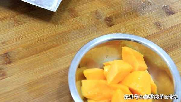 剥去黄桃的外皮以后,把黄桃切成小块放在盆中备用。
