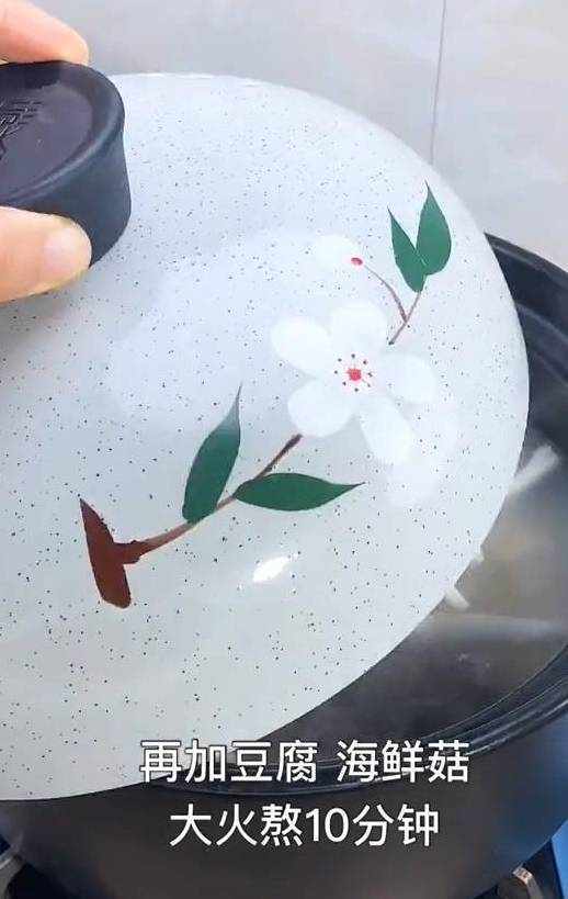 5.再加入豆腐、海鲜菇,大火熬10分钟