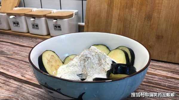 4、接着再往搅拌好的茄子中加入一勺淀粉,一勺面粉,少许胡椒粉,一勺食用盐,搅拌一下。面粉和淀粉的比例大约是1比1,具体的多少根据茄子的多少添加,也可以加入少量的泡打粉,这样口感更加的好吃。