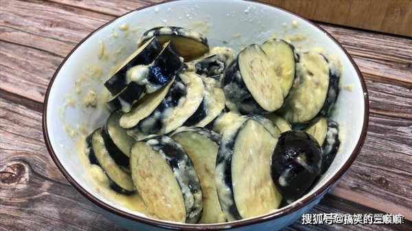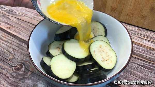3、碗中打入两个鸡蛋,用筷子给它搅散,也可以在鸡蛋液中加入少许的食用盐,把打好的鸡蛋加入到控干水分的茄子中,用筷子里的搅拌一下,有条件的可以带上一次性手套抓拌一下,让每一片茄子都裹上鸡蛋液,这一步很重要。