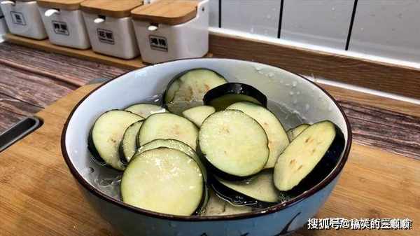 2、切好的茄子放入一个大碗中,加入没过茄子的清水,少许的白醋,用双手给它充分抓拌一下,再让茄子泡上两分钟,接着加入适量的白醋,可以防止茄子氧化变黑,颜色也更加的漂亮,秀色可餐,增加食欲。