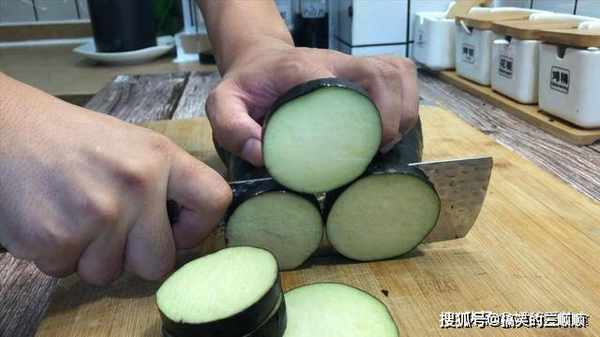 1、茄子把头部去除,不用去除茄子的外皮,把茄子切成厚一点的片,大约5毫米厚,太薄不容易操作,太厚又不容易入味,5毫米厚就刚刚好。