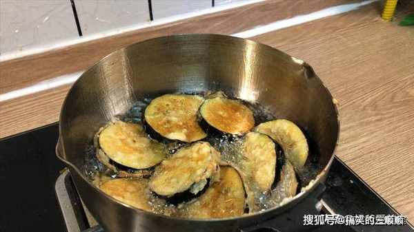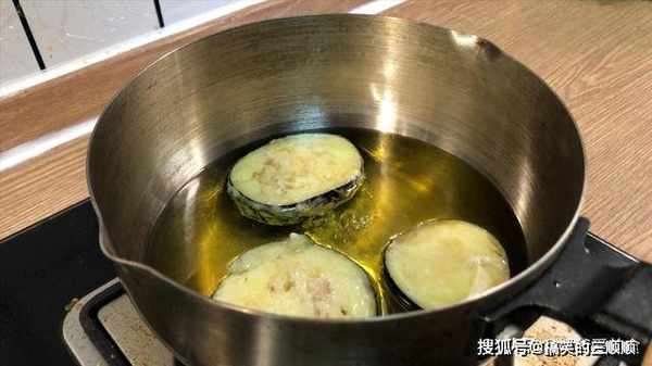 7、炸制茄子两面焦黄,外表娇娇脆脆的,然后给他捞出控油。炸制的时候火不能大,火太大容易把外表的面糊炸糊,里面的茄子还不熟。