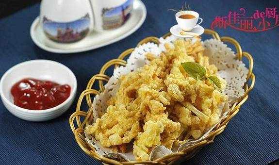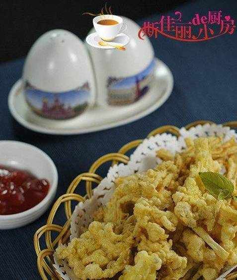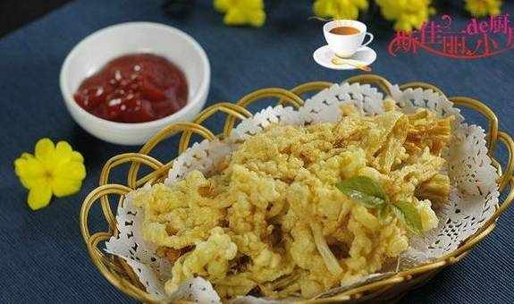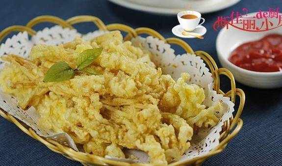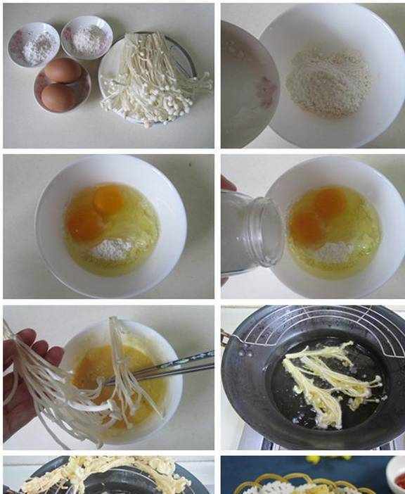 制作:1.准备好原材料;2.将面粉和淀粉按1:1的比例放入小碗中;3.打入鸡蛋;4.加入适量的盐打散备用;5.将金针菇撕成小朵放入鸡蛋液中裹一下;6烧锅油,油温至六、七成热时翻入金针菇金针炸熟后捞出;7.再将油温升高,将炸熟的金针菇放入里面复炸后至金黄色后捞出控油;8.盛入小筐中,配上一碟番茄酱。