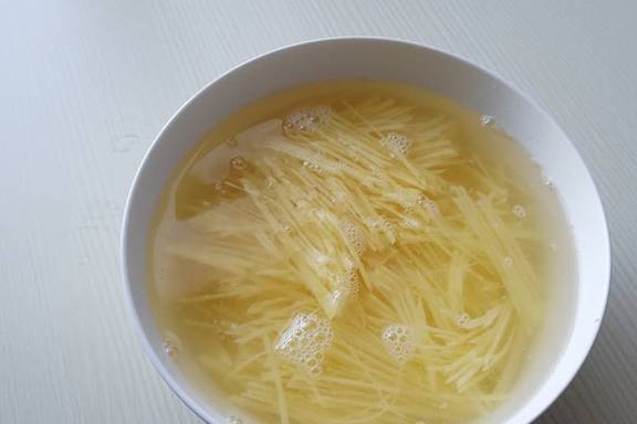 3.将切好的土豆丝放在清水中洗去淀粉,捞出待用