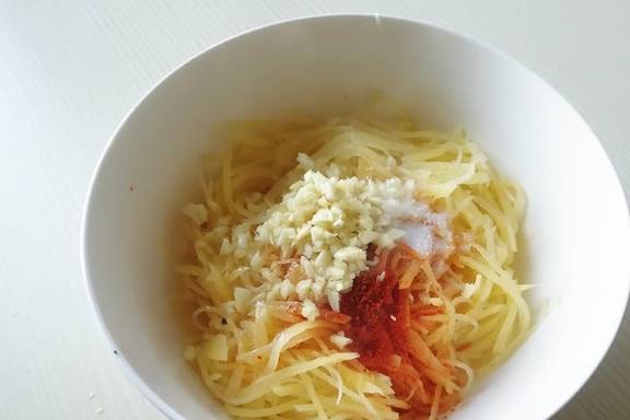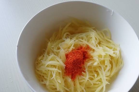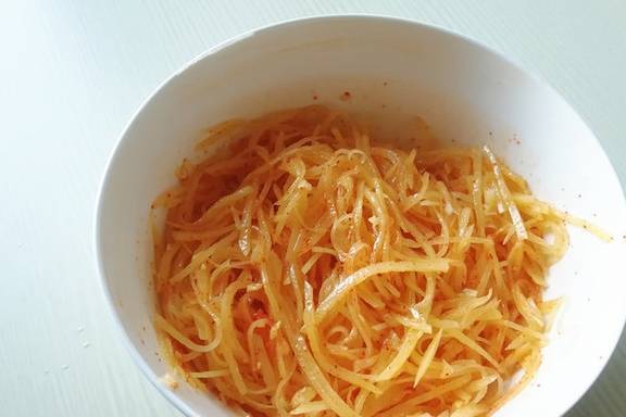 6.将土豆丝放在大碗中,撒上辣椒粉待用