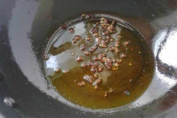 7.锅加油烧热,下入花椒,下火将花椒炸至微焦,将花椒捞出不用