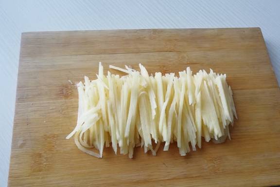 2.把土豆先切成片,在切成丝,丝的粗细要切得均匀一些