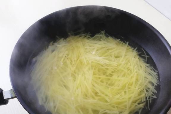 4.锅加水烧开,下入土豆丝焯水,将土豆丝焯水至断生,土豆丝焯熟了就可以,不要焯过火,焯过火土豆丝就碎了,口感也不脆嫩了