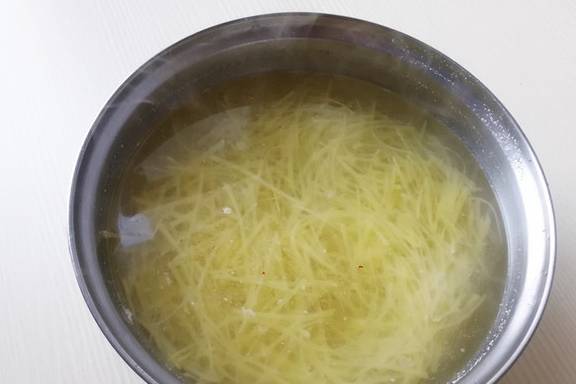 5.将土豆丝放在冷水中投凉,捞出控净水