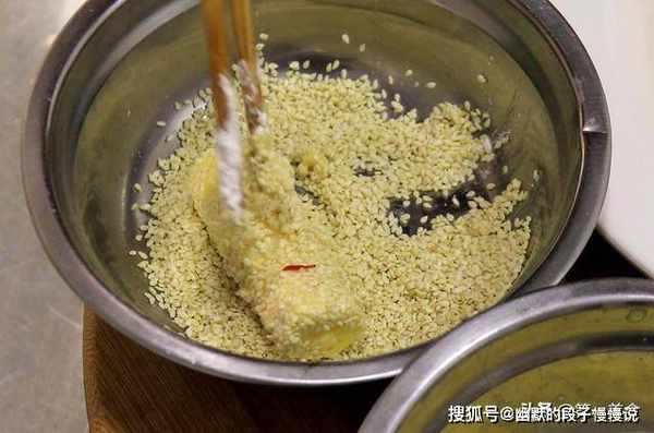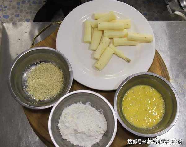 4.食材全部准备好后,我们开始制作,首先把山药段,裹上玉米淀粉,放入蛋液中裹上蛋液,再放入芝麻的盆中,裹上白芝麻。这样不但可以牢牢的粘住芝麻防止脱落,口感也更加的酥脆,把剩余的山药段 都裹上白芝麻。