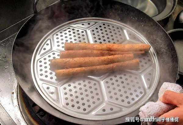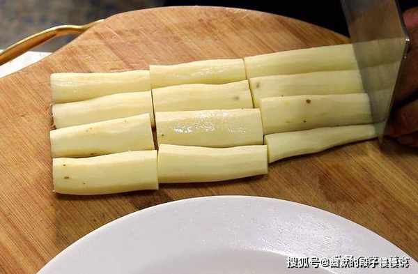 2.8分钟以后,山药已经蒸熟,把山药取出放凉以后,削去外皮,然后用清水把上面沾附的杂质清洗干净,切成5厘米大小的山药段。