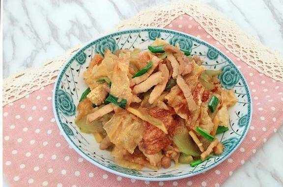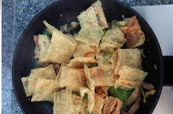 八、最后倒入准备好的腐竹(腐竹最好浸泡片刻,炒起来容易软化入味);