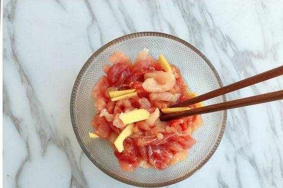 一、猪肉洗净切小条,用料酒、姜丝、酱油、盐油适量将其腌制20分钟备用;