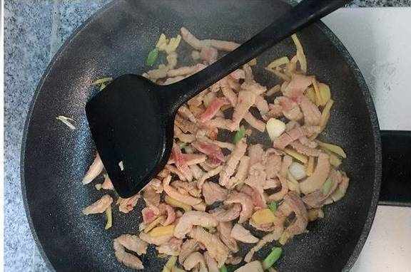 六、随后倒入腌制好的猪肉,大火翻炒至断生;