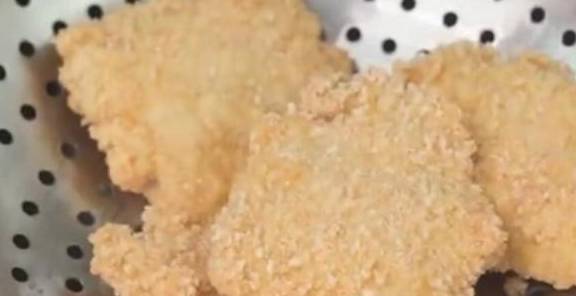 4、腌渍好的鸡肉接下来的步骤简单的用文字概括就是:拍粉、拖蛋液、裹面包糠;面包糠裹上以后用手轻轻压实,这样在后续的操作中能有效避免其脱落;