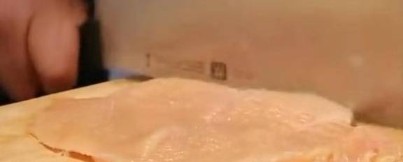 1、将鸡脯肉洗净,剔除筋膜,从中间片开,片成大片;用刀背在鸡脯肉上十字形轻斩,将肉锤松;