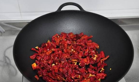 干红辣椒倒入铁锅中小火炒干点水分,盛出备用。