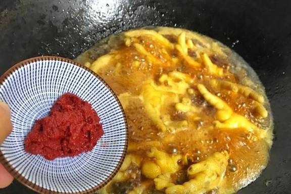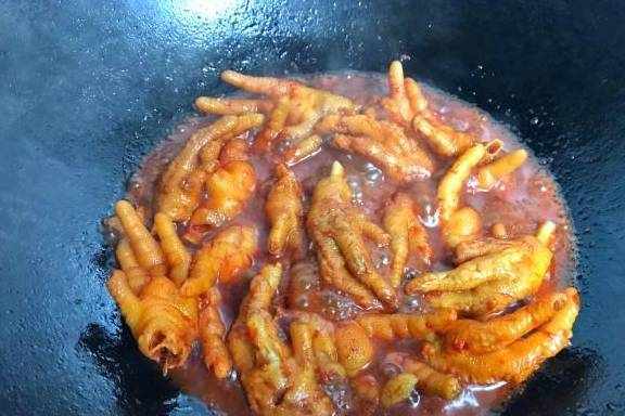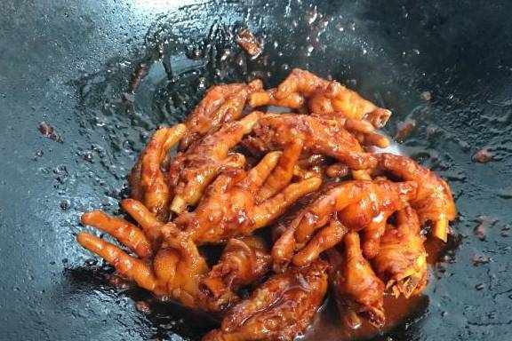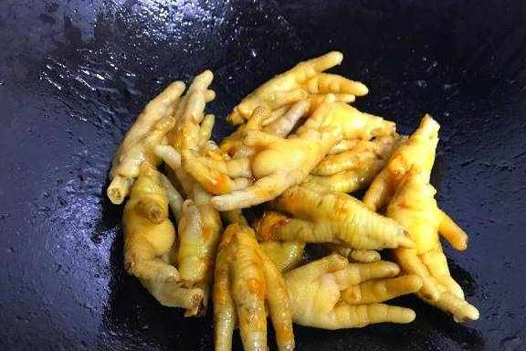 5、把沥干水分的鸡爪放入锅中,翻炒上色。